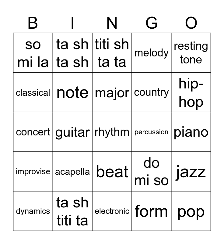 This bingo card has 39 words: harmony, tempo, chord, note, dynamics, beat, major, minor, resting tone, improvise, guitar, melody, rhythm, piano, percussion, acapella, collaborate, so mi la, do re mi, do mi so, classical, electronic, country, hip-hop, soul / RnB, rock, pop, reggae, ta titi ta ta, ta sh ta sh, ta ta ta ta, titi titi titi ta, titi sh ta ta, ta sh titi ta, form, call & response, jazz, concert and audience.