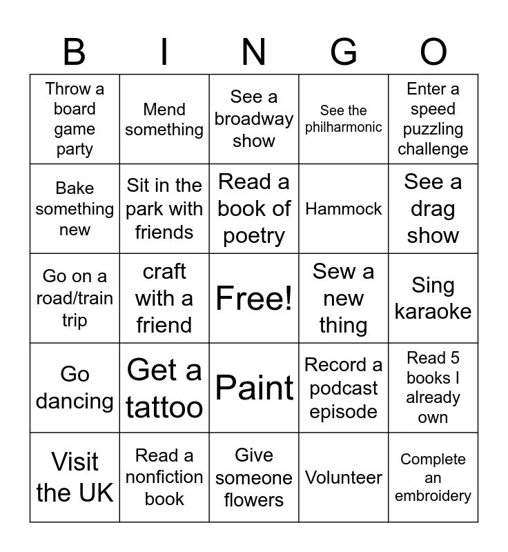 This bingo card has a free space and 24 words: Get a tattoo, Read a nonfiction book, Read a book of poetry, Visit the UK, Enter a speed puzzling challenge, Throw a board game party, Bake something new, Mend something, Sew a new thing, Paint, Hammock, Go on a road/train trip, Record a podcast episode, Read 5 books I already own, Sit in the park with friends, Volunteer, Sing karaoke, See a broadway show, See a drag show, craft with a friend, Complete an embroidery, Go dancing, See the philharmonic and Give someone flowers.