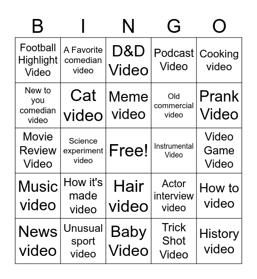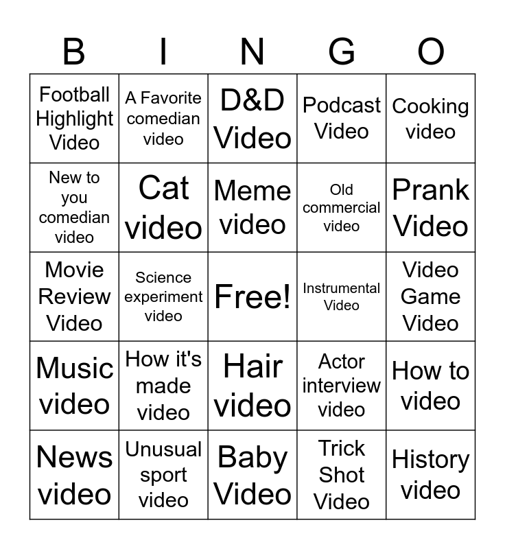 This bingo card has a free space and 24 words: How it's made video, Unusual sport video, Meme video, News video, Cooking video, Football Highlight Video, New to you comedian video, A Favorite comedian video, Instrumental Video, Hair video, Old commercial video, Movie Review Video, Actor interview video, How to video, Cat video, Trick Shot Video, Video Game Video, D&D Video, Prank Video, Science experiment video, History video, Music video, Podcast Video and Baby Video.