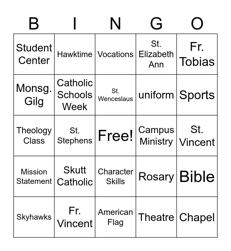 This bingo card has a free space and 24 words: Skutt Catholic, Fr. Vincent, St. Wenceslaus, Skyhawks, Fr. Tobias, Student Center, Monsg. Gilg, Hawktime, Campus Ministry, Character Skills, uniform, Theology Class, Rosary, Bible, Catholic Schools Week, Theatre, St. Vincent, Vocations, Sports, St. Stephens, Chapel, Mission Statement, St. Elizabeth Ann and American Flag.
