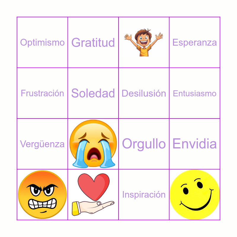 This bingo card has 7 images and 16 words: Alegría, Orgullo, Vergüenza, Gratitud, Esperanza, Inspiración, Entusiasmo, Confianza, Tristeza, Ansiedad, Optimismo, Soledad, Desilusión, Envidia, Frustración and Culpa.