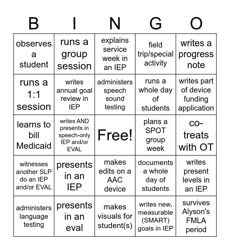 This bingo card has a free space and 24 words: presents in an IEP, presents in an eval, administers speech sound testing, administers language testing, writes a progress note, observes a student, runs a 1:1 session, runs a group session, plans a SPOT group week, makes edits on a AAC device, runs a whole day of students, learns to bill Medicaid, documents a whole day of students, writes present levels in an IEP, writes annual goal review in IEP, writes new, measurable (SMART) goals in IEP, co-treats with OT, explains service week in an IEP, writes part of device funding application, writes AND presents in speech-only IEP and/or EVAL, survives Alyson's FMLA period, witnesses another SLP do an IEP and/or EVAL, field trip/special activity and makes visuals for student(s).