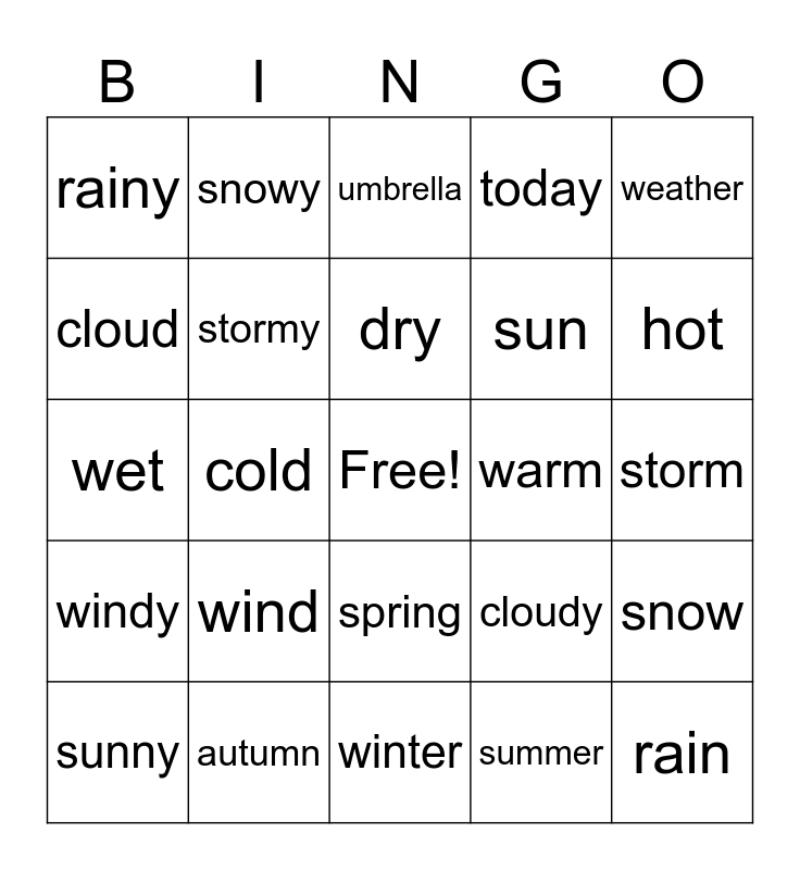 This bingo card has a free space and 24 words: wind, autumn, dry, sunny, weather, rainy, cloud, snowy, warm, spring, sun, wet, cloudy, snow, stormy, summer, storm, umbrella, hot, cold, rain, windy, today and winter.
