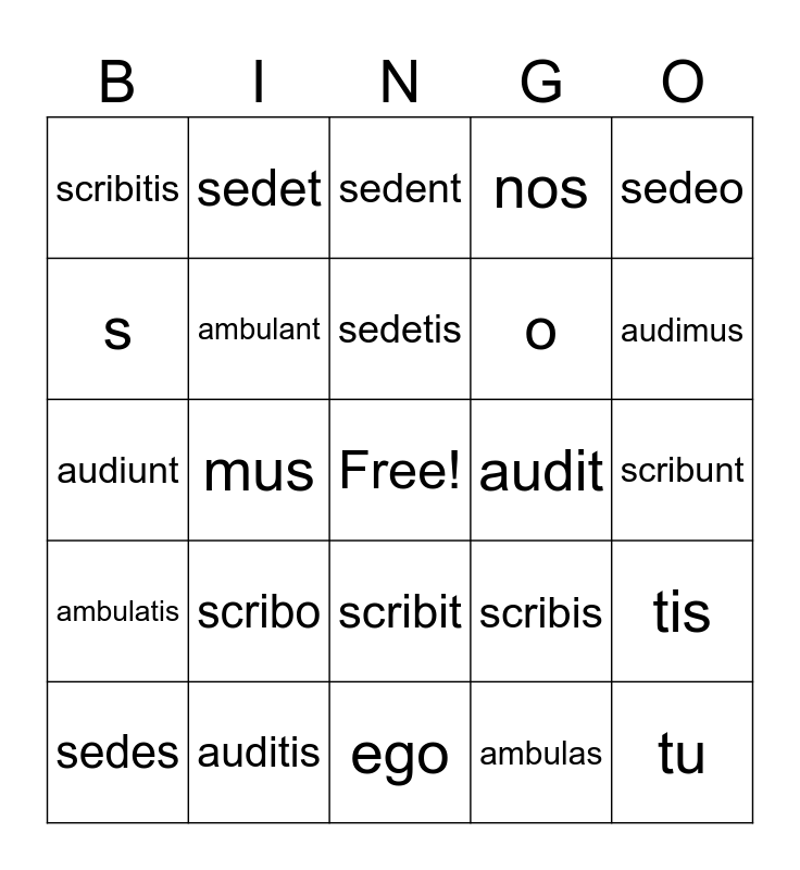 This bingo card has a free space and 34 words: ambulo, ambulas, ambulat, ambulamus, ambulatis, ambulant, sedeo, sedes, sedet, sedemus, sedetis, sedent, audio, audis, audit, audimus, auditis, audiunt, scribo, scribis, scribit, scribimus, scribitis, scribunt, ego, tu, nos, vos, o, s, t, mus, tis and nt.