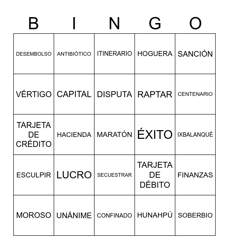This bingo card has a free space and 24 words: LUCRO, UNÁNIME, DISPUTA, MOROSO, SANCIÓN, DESEMBOLSO, VÉRTIGO, ANTIBIÓTICO, ÉXITO, SECUESTRAR, RAPTAR, TARJETA DE CRÉDITO, TARJETA DE DÉBITO, FINANZAS, CAPITAL, HUNAHPÚ, IXBALANQUÉ, ITINERARIO, CENTENARIO, HACIENDA, SOBERBIO, ESCULPIR, HOGUERA and CONFINADO.