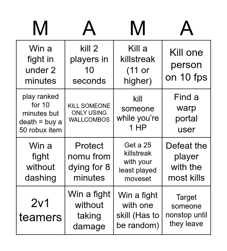 This bingo card has 16 words: Win a fight without taking damage, Defeat the player with the most kills, Kill a killstreak (11 or higher), Win a fight in under 2 minutes, Win a fight without dashing, kill 2 players in 10 seconds, Get a 25 killstreak with your least played moveset, Win a fight with one skill (Has to be random), play ranked for 10 minutes but death = buy a 50 robux item, KILL SOMEONE ONLY USING WALLCOMBOS, 2v1 teamers, Kill one person on 10 fps, Protect nomu from dying for 8 minutes, Find a warp portal user, kill someone while you’re 1 HP and Target someone nonstop until they leave.