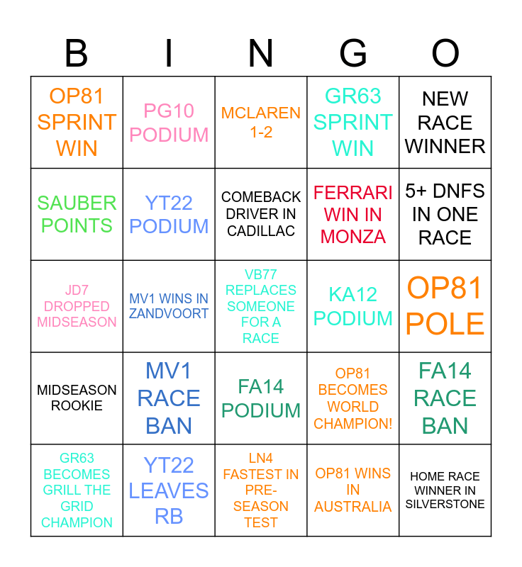 This bingo card has 25 words: MV1 RACE BAN, LN4 FASTEST IN PRE-SEASON TEST, COMEBACK DRIVER IN CADILLAC, GR63 BECOMES GRILL THE GRID CHAMPION, NEW RACE WINNER, OP81 SPRINT WIN, SAUBER POINTS, PG10 PODIUM, KA12 PODIUM, FA14 PODIUM, FERRARI WIN IN MONZA, JD7 DROPPED MIDSEASON, OP81 BECOMES WORLD CHAMPION!, FA14 RACE BAN, YT22 PODIUM, HOME RACE WINNER IN SILVERSTONE, OP81 POLE, MCLAREN 1-2, 5+ DNFS IN ONE RACE, MV1 WINS IN ZANDVOORT, VB77 REPLACES SOMEONE FOR A RACE, YT22 LEAVES RB, MIDSEASON ROOKIE, GR63 SPRINT WIN and OP81 WINS IN AUSTRALIA.