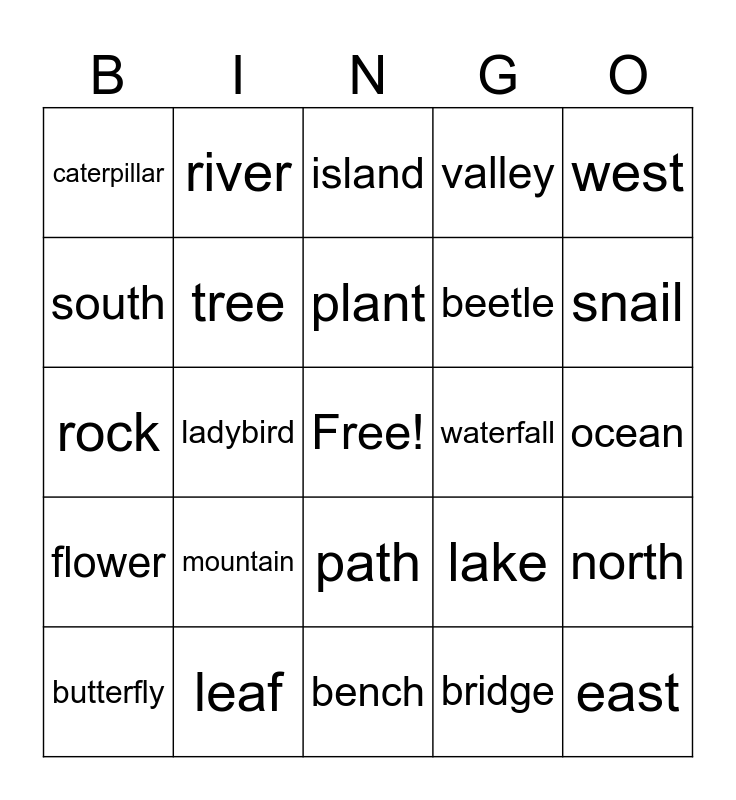 This bingo card has a free space and 24 words: mountain, leaf, plant, butterfly, west, caterpillar, south, river, waterfall, path, beetle, rock, lake, north, tree, bridge, ocean, island, snail, ladybird, east, flower, valley and bench.
