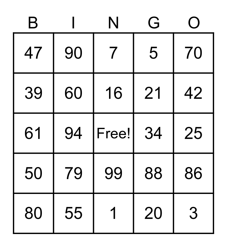 This bingo card has a free space and 34 words: 10, 20, 30, 40, 50, 60, 70, 80, 90, 100, 16, 7, 18, 23, 34, 42, 55, 61, 79, 88, 99, 53, 47, 25, 1, 3, 5, 11, 21, 39, 37, 94, 86 and 45.