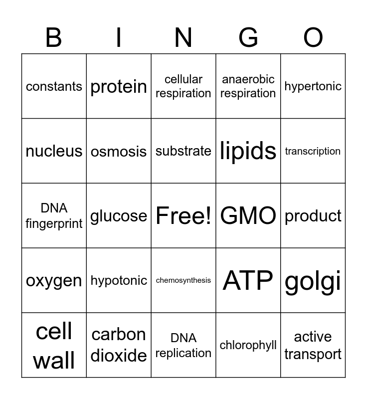 This bingo card has a free space and 49 words: translation, active transport, DNA, DNA replication, hypotonic, control group, protein, nucleotide, nucleus, eukaryote, osmosis, anaerobic respiration, golgi, ATP, photosynthesis, mitochondria, substrate, GMO, reactant, hypertonic, glucose, chlorophyll, constants, lipids, independent variable, transcription, cell wall, homeostasis, chemosynthesis, oxygen, enzyme, isotonic, plant cell, cells, carbon dioxide, ribosomes, dependent variable, chloroplast, product, vacuole, nucleic acid, cell membrane, RNA, amino acids, DNA fingerprint, cellular respiration, mutation, prokaryote and carbohydrates.