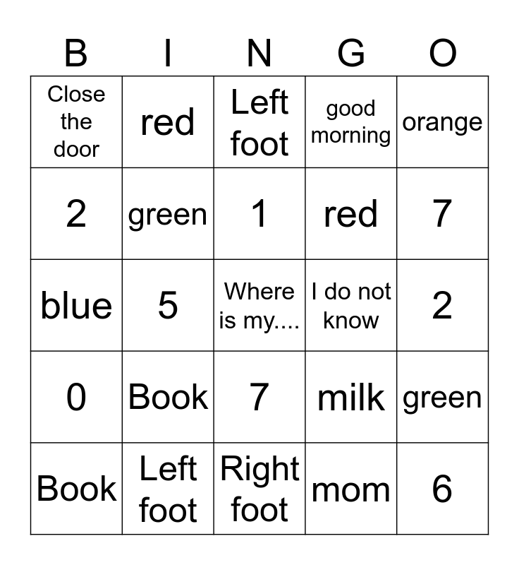 ⚠ This card has duplicate items: Right foot (2), Left foot (2), Head (2), Hand (2), Open the door (2), Close the door (2), shoes (2), Book (2), 10 (2), 8 (2), 4 (2), 1 (2), 2 (2), 3 (2), 5 (2), 6 (2), 7 (2), 9 (2), blue (2), green (2), red (2), good morning (2), 0 (2), Where is my.... (2), I do not know (2), It is here (2), banana (2), apple (2), milk (2), orange (2), I like to play (2), I can swim (2), My name is (2), What is your name? (2)