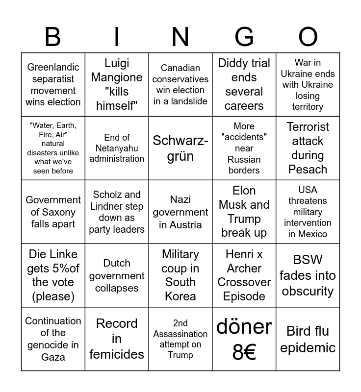 This bingo card has 25 words: Dutch government collapses, 2nd Assassination attempt on Trump, Schwarz-grün, Continuation of the genocide in Gaza, War in Ukraine ends with Ukraine losing territory, Greenlandic separatist movement wins election, "Water, Earth, Fire, Air" natural disasters unlike what we've seen before, Luigi Mangione "kills himself", Elon Musk and Trump break up, Military coup in South Korea, More "accidents" near Russian borders, Government of Saxony falls apart, Henri x Archer Crossover Episode, BSW fades into obscurity, End of Netanyahu administration, Bird flu epidemic, USA threatens military intervention in Mexico, Canadian conservatives win election in a landslide, Terrorist attack during Pesach, Scholz and Lindner step down as party leaders, Nazi government in Austria, Record in femicides, Die Linke gets 5%of the vote (please), Diddy trial ends several careers and döner 8€.