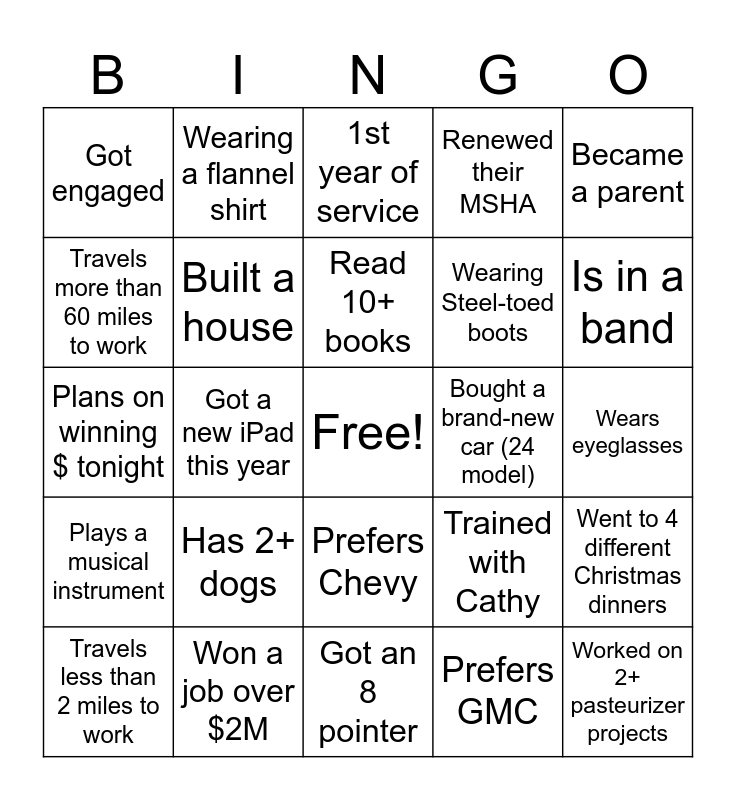 This bingo card has a free space and 84 words: 5 + years of service, 3 years or less of service, 1st year of service, 10 years of service, 15 + years of service, 20 + years of service, Same last name as another employee, Fished in 3 or more Bass Tournaments, Traveled out of Country, Traveled to Colorado, Retired, Bought a new house, Built a house, Bought a brand-new car (24 model), Got married, Got engaged, Travels less than 2 miles to work, Travels more than 60 miles to work, Spouse/partner works in the same industry, Sibling works here, 2 or more family members work here, Wearing Steel-toed boots, Worked on 2+ pasteurizer projects, Worked on 2+ outages, Got a new iPad this year, Prefers Fyle over HH2, Has 4+ children, Owns cows, Owns horses, Owns chickens, Has 2+ dogs, Got a new puppy, Traveled to another state to work, Plans on winning $ tonight, Plans on losing $ tonight, Has a boat, Got an 8 pointer, Makes their own sausage, Is in a band, Plays a musical instrument, Went to 3+ concerts, Grew a mustache, Is not wearing socks, Wearing a tie, Doesn’t own a tie, Owns a flannel shirt, Wearing a flannel shirt, Prefers Red Wing boots, Prefers Keen boots, Worked a Service Call job, Performed a Site Safety Audit, Trained with Cathy, Renewed their MSHA, Bid a job over $500k, Bid a job over $2M, Won a job over $500k, Won a job over $2M, Read 10+ books, Did a major home improvement project, Wears eyeglasses, Prefers tea over coffee, Prefers coffee over tea, Thinks Acme is the best place to work, Broke a tool, Is staying at the casino hotel tonight, Worked on an Ameren project, Worked on a Hitachi project, Became a grandparent, Became a parent, Worked on a Nestle project, Went to 4 different Christmas dinners, Knows the name of everyone at their table, Owns a 20+ year old car, Prefers Ford, Prefers Chevy, Prefers GMC, Lives in IL, Is Gluten Intolerant, Is Lactose Intolerant, Is wearing a hat, Is wearing a Richardson 112, Is wearing company apparel, Retiring in 5 years or less and Retiring in 5-10 years.