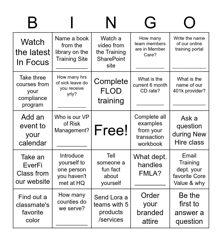This bingo card has a free space and 24 words: Introduce yourself to one person you haven't met at HQ, How many counties do we serve? __________, Complete FLOD training, Find out a classmate's favorite color, Write the name of our online training portal _____________, Watch the latest In Focus, Take three courses from your compliance program, Name a book from the library on the Training Site __________, Complete all examples from your transaction workbook, Tell someone a fun fact about yourself, What is the current 6 month CD rate? __________, Add an event to your calendar, What dept. handles FMLA? ________, Email Training dept. your favorite Core Value & why, How many hrs of sick leave do you receive yrly? ___________, Order your branded attire, Ask a question during New Hire class, Watch a video from the Training SharePoint site, What is the name of our 401k provider? ____________, Who is our VP of Risk Management? __________, Be the first to answer a question, Take an EverFi Class from our website, How many team members are in Member Care? ___________ and Send Lora a teams with 5 products /services.