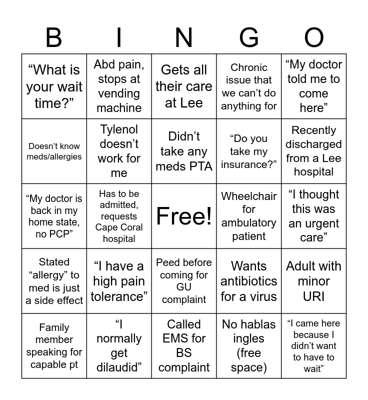 This bingo card has a free space and 24 words: “I have a high pain tolerance”, “I normally get dilaudid”, Didn’t take any meds PTA, Family member speaking for capable pt, “My doctor told me to come here”, “What is your wait time?”, Doesn’t know meds/allergies, Abd pain, stops at vending machine, Wheelchair for ambulatory patient, Peed before coming for GU complaint, “Do you take my insurance?”, “My doctor is back in my home state, no PCP”, Wants antibiotics for a virus, Adult with minor URI, Tylenol doesn’t work for me, No hablas ingles (free space), “I thought this was an urgent care”, Gets all their care at Lee, Recently discharged from a Lee hospital, Has to be admitted, requests Cape Coral hospital, “I came here because I didn’t want to have to wait”, Stated “allergy” to med is just a side effect, Chronic issue that we can’t do anything for and Called EMS for BS complaint.