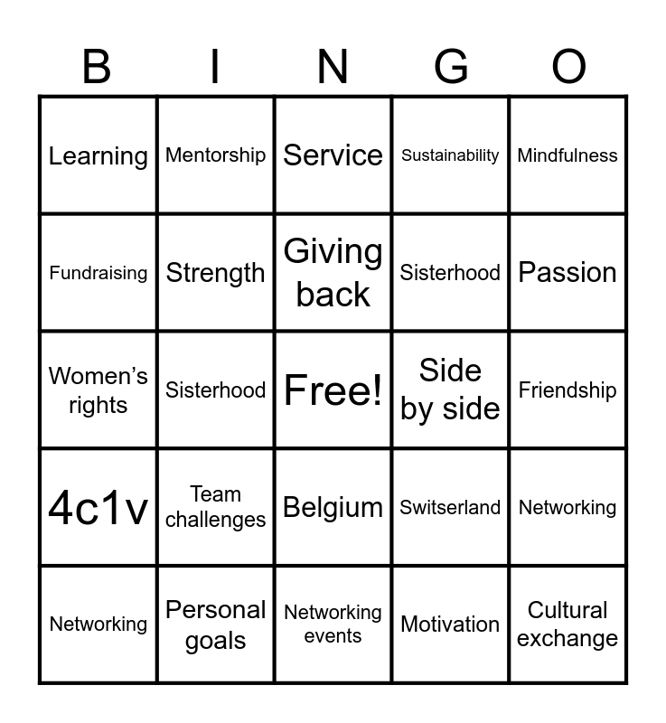 This bingo card has a free space and 74 words: Charity, Growth, Service, Empowerment, Friendship, Collaboration, Teamwork, Leadership, Networking, Middle European, Volunteering, Inspiration, Giving back, Fundraising, Personal development, Sisterhood, Change, Passion, Global impact, Women’s rights, Strength, Mentorship, Sustainability, Well-being, Cultural exchange, Diversity, Solidarity, Reflection, Fundraising events, Social responsibility, Mindfulness, Community support, Inspiration, Professional growth, Role models, Motivation, Voluntary work, Team spirit, Self-care, Inclusion, Networking events, Personal goals, Collective impact, Leadership development, Best practices, Learning, Gratitude, Team challenges, Empowering women, Charity, GB&I, Service, Friendship, Travel, Circling, Projects, Belgium, Empowerment, Fundraising, Networking, Sisterhood, Round Table Family, 4c1v, Tangent, Side by side, Growth, Teamwork, The Netherlands, Switserland, Romania, Germany, Austria, Luxembourg and President.