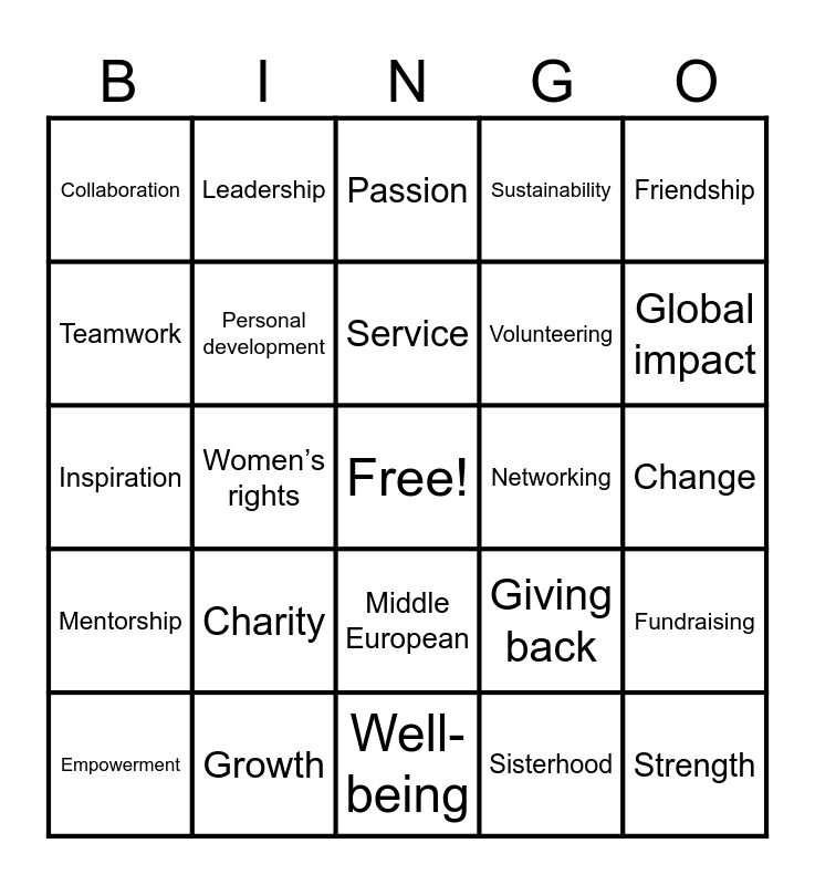 This bingo card has a free space and 24 words: Charity, Growth, Service, Empowerment, Friendship, Collaboration, Teamwork, Leadership, Networking, Middle European, Volunteering, Inspiration, Giving back, Fundraising, Personal development, Sisterhood, Change, Passion, Global impact, Women’s rights, Strength, Mentorship, Sustainability and Well-being.