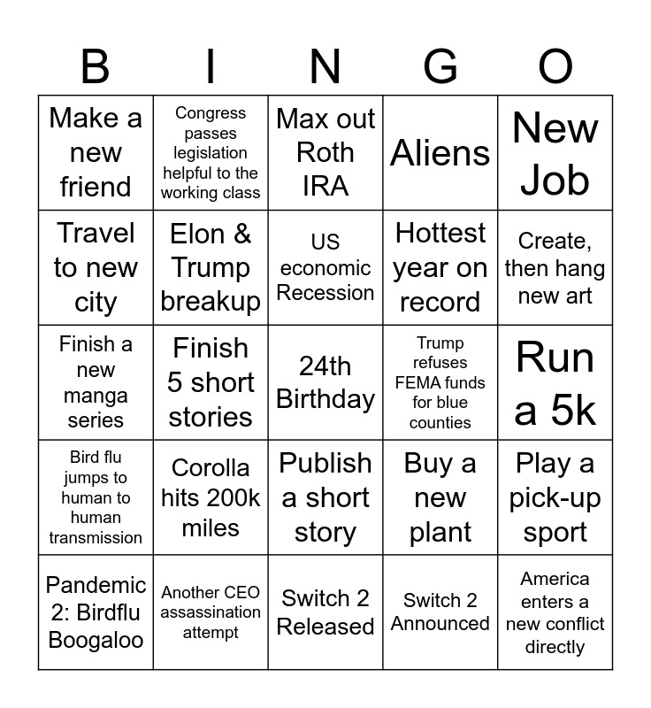 This bingo card has a free space and 24 words: Corolla hits 200k miles, Another CEO assassination attempt, US economic Recession, Pandemic 2: Birdflu Boogaloo, New Job, Make a new friend, Travel to new city, Congress passes legislation helpful to the working class, Trump refuses FEMA funds for blue counties, Publish a short story, Hottest year on record, Finish a new manga series, Buy a new plant, Play a pick-up sport, Elon & Trump breakup, Switch 2 Announced, Run a 5k, Max out Roth IRA, Create, then hang new art, Finish 5 short stories, America enters a new conflict directly, Bird flu jumps to human to human transmission, Aliens and Switch 2 Released.