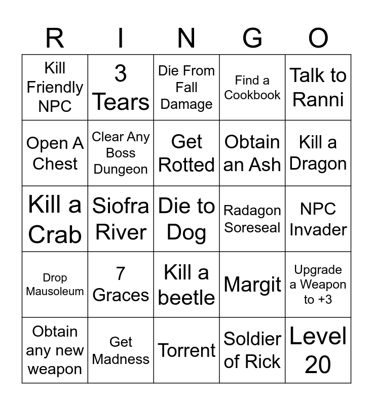 This bingo card has 25 words: 7 Graces, Torrent, Get Rotted, Obtain any new weapon, Talk to Ranni, Kill Friendly NPC, Open A Chest, 3 Tears, Radagon Soreseal, Kill a beetle, Obtain an Ash, Kill a Crab, Margit, Upgrade a Weapon to +3, Clear Any Boss Dungeon, Level 20, NPC Invader, Die From Fall Damage, Kill a Dragon, Siofra River, Die to Dog, Get Madness, Drop Mausoleum, Find a Cookbook and Soldier of Rick.