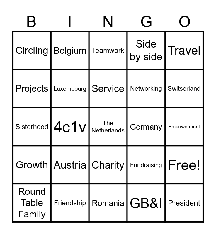 This bingo card has 26 words: Charity, GB&I, Service, Friendship, Travel, Circling, Projects, Belgium, Empowerment, Fundraising, Networking, Sisterhood, Free!, Round Table Family, 4c1v, Tangent, Side by side, Growth, Teamwork, The Netherlands, Switserland, Romania, Germany, Austria, Luxembourg and President.