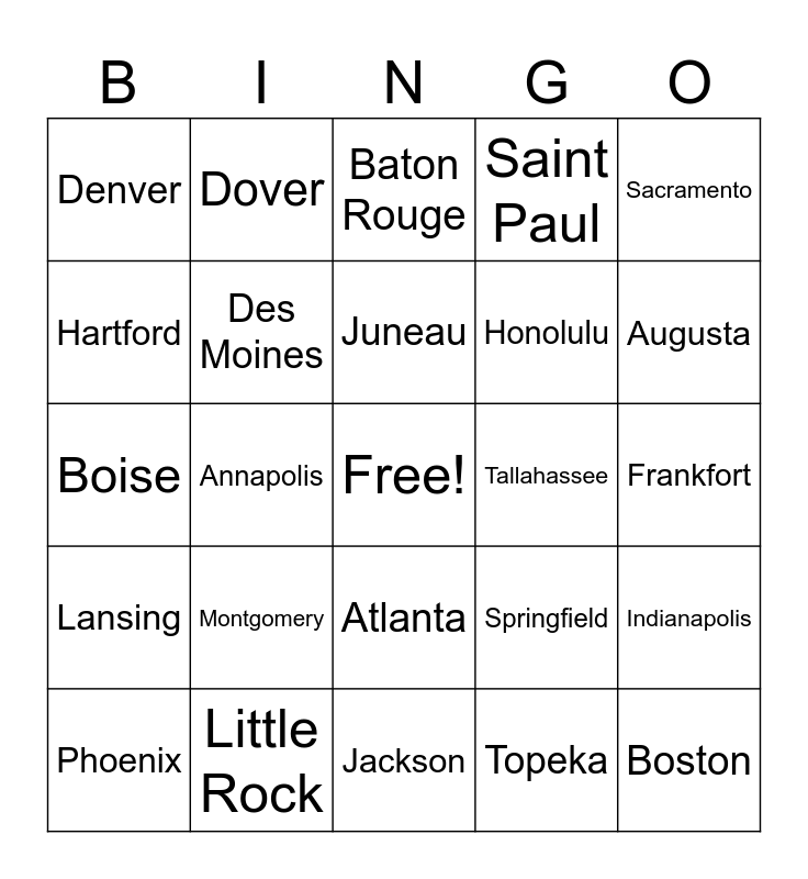 This bingo card has a free space and 24 words: Montgomery, Little Rock, Juneau, Phoenix, Sacramento, Denver, Hartford, Dover, Tallahassee, Atlanta, Honolulu, Boise, Springfield, Indianapolis, Des Moines, Topeka, Frankfort, Baton Rouge, Augusta, Annapolis, Boston, Lansing, Saint Paul and Jackson.