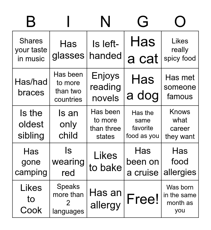 This bingo card has 30 words: Speaks more than 2 languages, Likes pineapple on pizza, Is an only child, Can play multiple instruments, Shares your taste in music, Is left-handed, Has been to more than two countries, Likes to bake, Has the same favorite food as you, Has an allergy, Knows what career they want, Has been to more than three states, Free!, Was born in the same month as you, Has met someone famous, Has been to multiple concerts, Has been on a cruise, Has gone camping, Is wearing red, Likes really spicy food, Is the oldest sibling, Likes skiing/ snowboarding, Has glasses, Has a dog, Has/had braces, Has a cat, Has food allergies, Likes to Cook, Enjoys reading novels and Likes to compete.