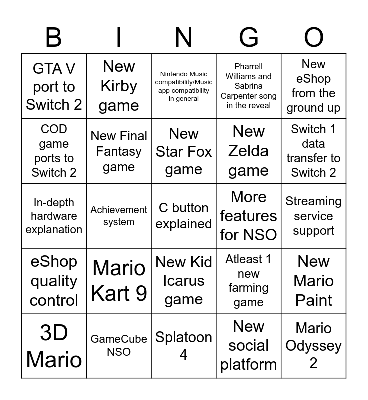 This bingo card has a free space and 24 words: Mario Kart 9, GameCube NSO, New Star Fox game, 3D Mario, New eShop from the ground up, GTA V port to Switch 2, COD game ports to Switch 2, New Kirby game, More features for NSO, New Kid Icarus game, New Zelda game, In-depth hardware explanation, Atleast 1 new farming game, New Mario Paint, New Final Fantasy game, New social platform, Streaming service support, Nintendo Music compatibility/Music app compatibility in general, Switch 1 data transfer to Switch 2, Achievement system, Mario Odyssey 2, eShop quality control, Pharrell Williams and Sabrina Carpenter song in the reveal and Splatoon 4.