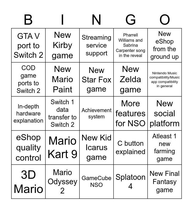 This bingo card has 25 words: Mario Kart 9, GameCube NSO, New Star Fox game, 3D Mario, New eShop from the ground up, GTA V port to Switch 2, COD game ports to Switch 2, New Kirby game, More features for NSO, New Kid Icarus game, New Zelda game, In-depth hardware explanation, C button explained, Atleast 1 new farming game, New Mario Paint, New Final Fantasy game, New social platform, Streaming service support, Nintendo Music compatibility/Music app compatibility in general, Switch 1 data transfer to Switch 2, Achievement system, Mario Odyssey 2, eShop quality control, Pharrell Williams and Sabrina Carpenter song in the reveal and Splatoon 4.