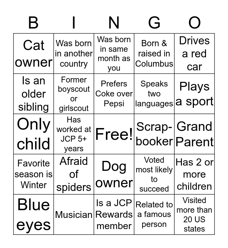 This bingo card has a free space and 24 words: Afraid of spiders, Musician, Prefers Coke over Pepsi, Blue eyes, Drives a red car, Cat owner, Is an older sibling, Was born in another country, Scrap-booker, Dog owner, Speaks two languages, Only child, Voted most likely to succeed, Has 2 or more children, Former boyscout or girlscout, Related to a famous person, Grand Parent, Was born in same month as you, Plays a sport, Has worked at JCP 5+ years, Visited more than 20 US states, Favorite season is Winter, Born & raised in Columbus and Is a JCP Rewards member.