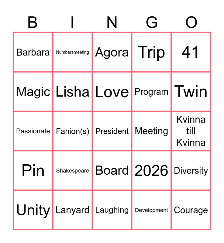 This bingo card has 44 words: Free!, President, Strength, Unity, Passion, Development, Agora, Round Table, 41, Lanyard, Trip, Meeting, Board, Shakespeare, Stratford upon Avon, Laughing, Memorable, Passionate, Creative, Twin, Numbersmeeting, Friendship Friday, Social Media, Barbara, LCI, Kvinna till Kvinna, AGM, Brasov, 2026, Pin, Motivation, Diversity, One Team, one dream, Gala, Fanion(s), Agenda, Support, Courage, Love, Magic, Program, Special, Lisha and Regional Chair.