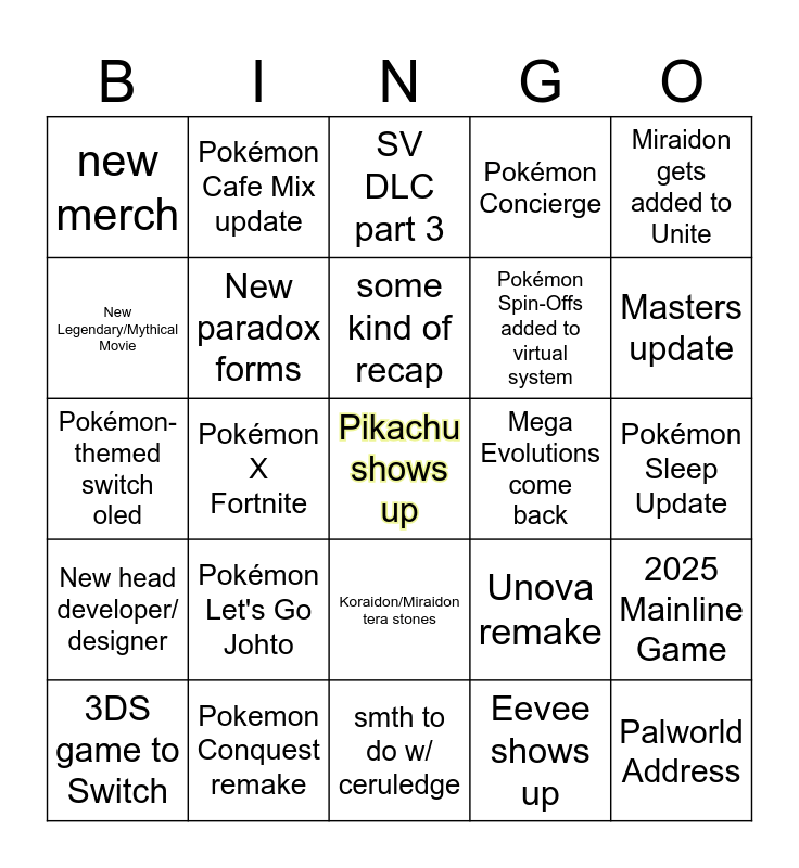 This bingo card has a free space and 24 words: Pokémon Let's Go Johto, Pokemon Conquest remake, some kind of recap, 3DS game to Switch, Miraidon gets added to Unite, new merch, New Legendary/Mythical Movie, Pokémon Cafe Mix update, Mega Evolutions come back, Koraidon/Miraidon tera stones, Pokémon Spin-Offs added to virtual system, Pokémon-themed switch oled, Unova remake, 2025 Mainline Game, New paradox forms, Eevee shows up, Pokémon Sleep Update, SV DLC part 3, Masters update, Pokémon X Fortnite, Palworld Address, New head developer/ designer, Pokémon Concierge and smth to do w/ ceruledge.