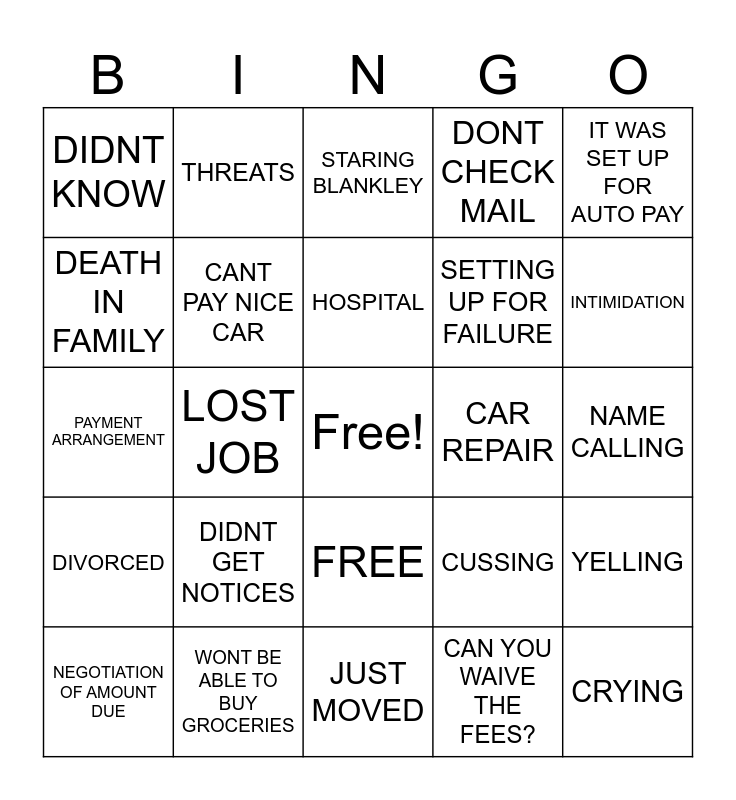 This bingo card has a free space and 25 words: DIDNT GET NOTICES, JUST MOVED, HOSPITAL, NEGOTIATION OF AMOUNT DUE, IT WAS SET UP FOR AUTO PAY, DIDNT KNOW, DEATH IN FAMILY, THREATS, CAR REPAIR, FREE, SETTING UP FOR FAILURE, PAYMENT ARRANGEMENT, CUSSING, YELLING, CANT PAY NICE CAR, BROKE, NAME CALLING, STARING BLANKLEY, INTIMIDATION, LOST JOB, CRYING, WONT BE ABLE TO BUY GROCERIES, DIVORCED, DONT CHECK MAIL and CAN YOU WAIVE THE FEES?.
