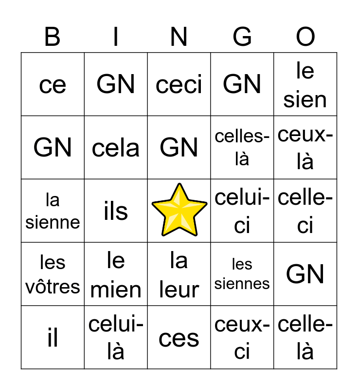 This bingo card has a free space and 29 words: il, elle, ils, elles, ce, ceci, cela, le mien, celui-ci, celui-là, celle-ci, celle-là, ces, ceux-ci, ceux-là, les siens, la leur, les vôtres, le sien, la sienne, les siennes, celles-ci, celles-là, GN, GN, GN, GN, GN and GN.