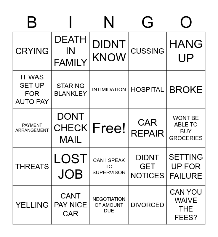 This bingo card has a free space and 27 words: DIDNT GET NOTICES, JUST MOVED, HOSPITAL, NEGOTIATION OF AMOUNT DUE, IT WAS SET UP FOR AUTO PAY, DIDNT KNOW, DEATH IN FAMILY, THREATS, CAR REPAIR, SETTING UP FOR FAILURE, PAYMENT ARRANGEMENT, CUSSING, YELLING, CANT PAY NICE CAR, BROKE, NAME CALLING, STARING BLANKLEY, INTIMIDATION, LOST JOB, CRYING, WONT BE ABLE TO BUY GROCERIES, DIVORCED, DONT CHECK MAIL, CAN YOU WAIVE THE FEES?, CAN I SPEAK TO SUPERVISOR, HANG UP and I THOUGHT SOMEONE ELSE PAID.