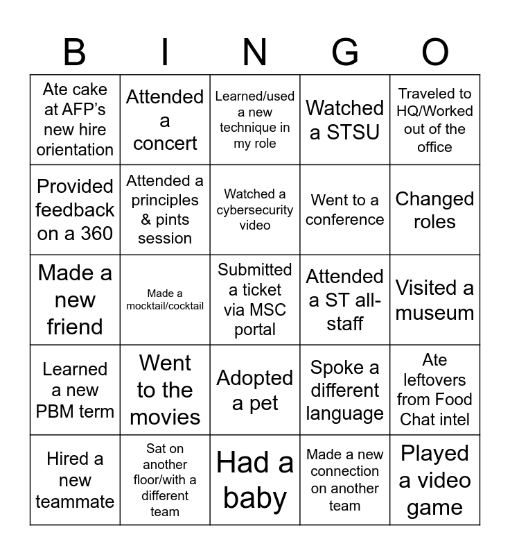 This bingo card has 61 words: Free!, Sat on another floor/with a different team, Collab’d with someone new, Learned a new PBM term, Made a new connection on another team, Joined a book nook club, Attended a principles & pints session, Attended an infra HH, Went to a conference, Had lunch w a coworker, Watched a STSU, Complimented a teammate, Provided feedback on a 360, Wore/used my ST swag, Updated my RREs, Ate cake at AFP’s new hire orientation, Submitted a ticket via MSC portal, Traveled to HQ/Worked out of the office, Sat on an interview panel, Watched a cybersecurity video, Attended a ST all-staff, Learned/used a new technique in my role, Hired a new teammate, Ate leftovers from Food Chat intel, Poured myself a nitro brew, Said hi to Henry at the Nespresso machine, Completed a project, Read Believe in People, Changed roles, Helped open a field office, Facilitated a training, Earned a certification, Started working at ST!, Took a vacation, Attended a concert, Traveled to a new city, Tried a new restaurant, Made a mocktail/cocktail, Learned a new hobby, Made a new friend, Read a book, Went to the movies, Visited a museum, Sang karaoke, Spoke a different language, Played a sport, Went swimming, Cooked a new meal, Moved to a new house/apt, Adopted a pet, Had a baby, Became an aunt/uncle, Binged a series, Rode a bicycle, Laughed ‘til I cried, Celebrated a March birthday, Celebrated a June birthday, Celebrated an October birthday, Watched a sunrise, Played a video game and Went skydiving.