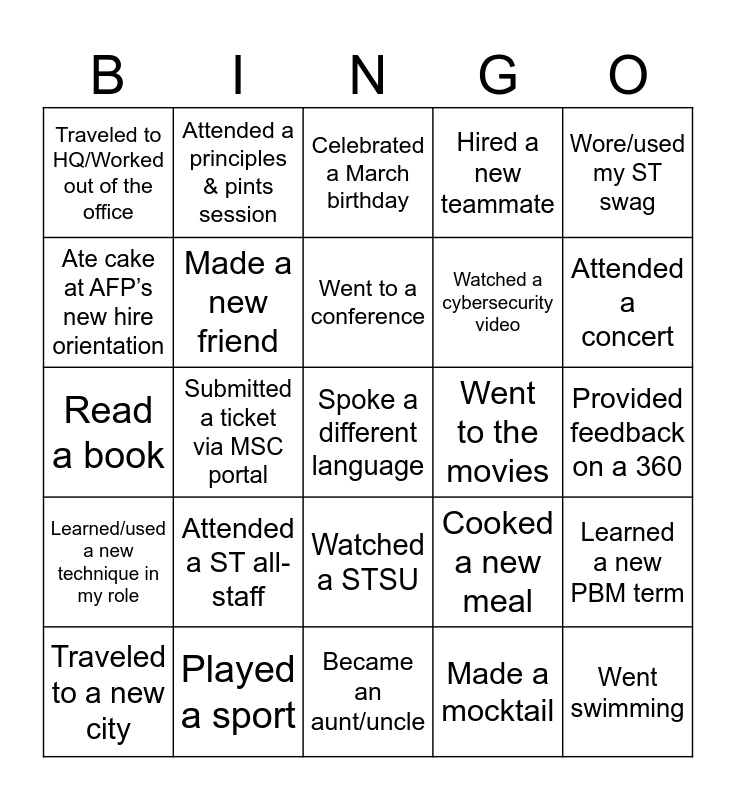 This bingo card has 63 words: Free!, Sat on another floor/with a different team, Collab’d with someone new, Learned a new PBM term, Made a new connection on another team, Joined a book nook club, Attended a principles & pints session, Attended an infra HH, Went to a conference, Had lunch w a coworker, Watched a STSU, Complimented a teammate, Provided feedback on a 360, Wore/used my ST swag, Updated my RREs, Ate cake at AFP’s new hire orientation, Submitted a ticket via MSC portal, Traveled to HQ/Worked out of the office, Sat on an interview panel, Watched a cybersecurity video, Attended a ST all-staff, Learned/used a new technique in my role, Hired a new teammate, Ate leftovers from Food Chat intel, Poured myself a nitro brew, Said hi to Henry at the Nespresso machine, Completed a project, Read Believe in People, Changed roles, Helped open a field office, Facilitated a training, Earned a certification, Started working at ST!, Took a vacation, Attended a concert, Traveled to a new city, Tried a new restaurant, Made a mocktail, Learned a new hobby, Made a new friend, Read a book, Went to the movies, Visited a museum, Sang karaoke, Spoke a different language, Played a sport, Went swimming, Cooked a new meal, Moved to a new house/apt, Adopted a pet, Had a baby, Became an aunt/uncle, Binged a series, Rode a bicycle, Laughed ‘til I cried, Celebrated a March birthday, Celebrated a June birthday, Celebrated an October birthday, Watched a sunrise, Played a video game, Went skydiving, Put up holiday decorations and Watched fireworks.