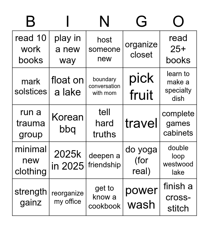 This bingo card has 25 words: 2025k in 2025, get to know a cookbook, boundary conversation with mom, strength gainz, read 25+ books, read 10 work books, mark solstices, play in a new way, travel, deepen a friendship, pick fruit, run a trauma group, do yoga (for real), double loop westwood lake, float on a lake, finish a cross-stitch, complete games cabinets, host someone new, learn to make a specialty dish, Korean bbq, tell hard truths, reorganize my office, minimal new clothing, organize closet and power wash.