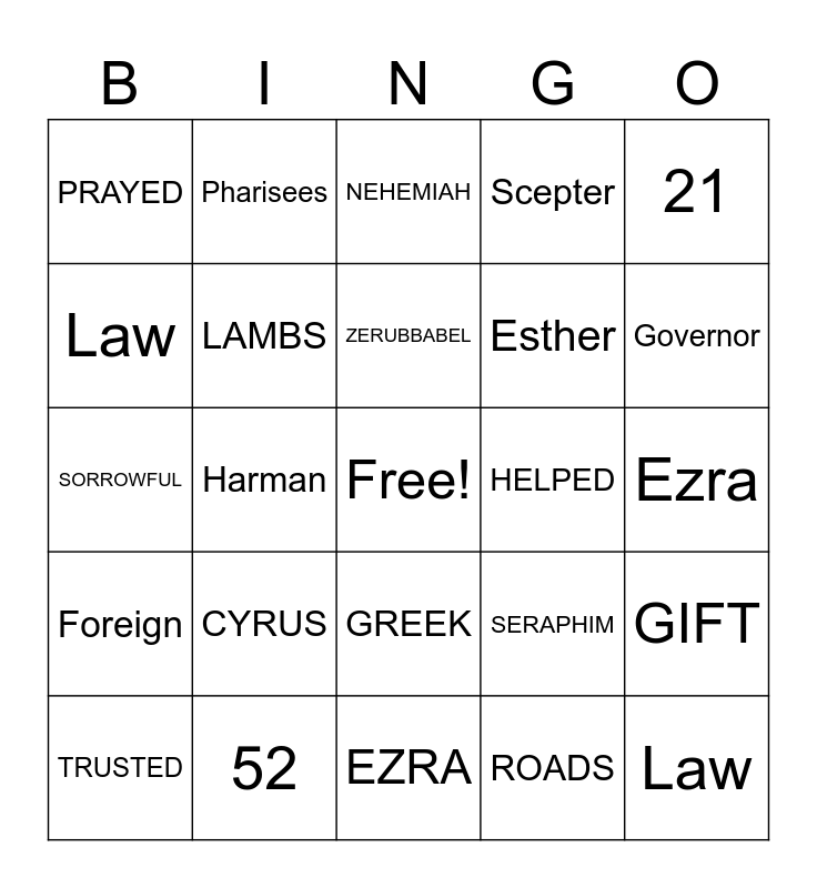 This bingo card has a free space and 38 words: EZEKIEL, JEREMIAH, SHEEP, LAMBS, GIFT, CYRUS, ZERUBBABEL, TEMPLE, 21, Esther, Harman, Scepter, Law, Ezra, Law, Foreign, Forgive, NEHEMIAH, WALLS, HELPED, PRAYED, 52, Governor, TRUSTED, LISTENED, EZRA, MESSENGER, ANGEL, JOHNTB, 400, DANIEL, GREEK, ROADS, Pharisees, Sadducees, SERAPHIM, SORROWFUL and JESUS.