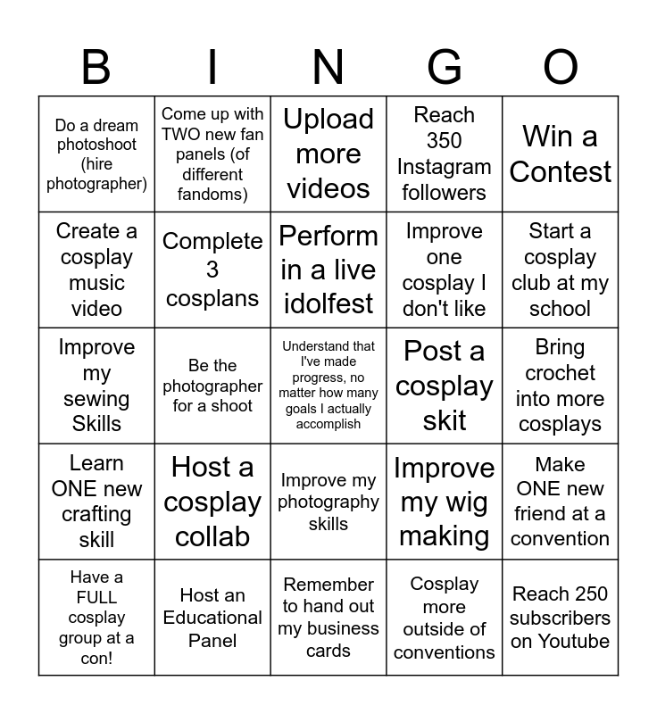 This bingo card has a free space and 24 words: Host a cosplay collab, Host an Educational Panel, Perform in a live idolfest, Have a FULL cosplay group at a con!, Win a Contest, Do a dream photoshoot (hire photographer), Create a cosplay music video, Come up with TWO new fan panels (of different fandoms), Post a cosplay skit, Improve my photography skills, Improve one cosplay I don't like, Improve my sewing Skills, Improve my wig making, Make ONE new friend at a convention, Complete 3 cosplans, Cosplay more outside of conventions, Bring crochet into more cosplays, Upload more videos, Start a cosplay club at my school, Be the photographer for a shoot, Reach 250 subscribers on Youtube, Learn ONE new crafting skill, Reach 350 Instagram followers and Remember to hand out my business cards.