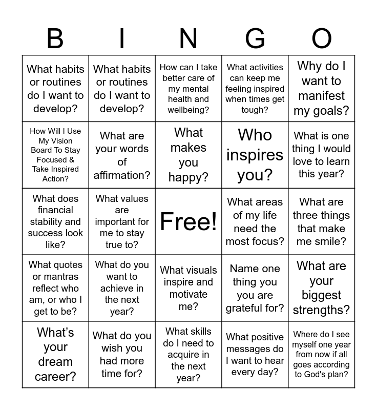 This bingo card has a free space and 24 words: What do you want to achieve in the next year?, What do you wish you had more time for?, What makes you happy?, What’s your dream career?, Why do I want to manifest my goals?, What habits or routines do I want to develop?, How Will I Use My Vision Board To Stay Focused & Take Inspired Action?, What habits or routines do I want to develop?, What areas of my life need the most focus?, What visuals inspire and motivate me?, Who inspires you?, What does financial stability and success look like?, Name one thing you you are grateful for?, What are your biggest strengths?, What are your words of affirmation?, What positive messages do I want to hear every day?, What are three things that make me smile?, How can I take better care of my mental health and wellbeing?, What is one thing I would love to learn this year?, What values are important for me to stay true to?, Where do I see myself one year from now if all goes according to God's plan?, What quotes or mantras reflect who am, or who I get to be?, What activities can keep me feeling inspired when times get tough? and What skills do I need to acquire in the next year?.