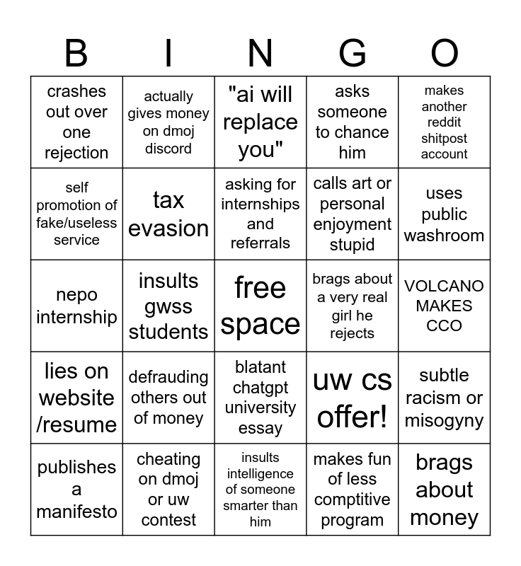 This bingo card has a free space and 24 words: defrauding others out of money, cheating on dmoj or uw contest, asking for internships and referrals, publishes a manifesto, makes another reddit shitpost account, crashes out over one rejection, self promotion of fake/useless service, actually gives money on dmoj discord, brags about a very real girl he rejects, blatant chatgpt university essay, calls art or personal enjoyment stupid, nepo internship, uw cs offer!, subtle racism or misogyny, tax evasion, makes fun of less comptitive program, VOLCANO MAKES CCO, "ai will replace you", uses public washroom, insults gwss students, brags about money, lies on website /resume, asks someone to chance him and insults intelligence of someone smarter than him.