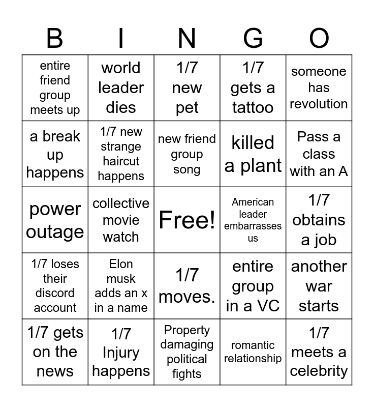 This bingo card has a free space and 29 words: natural disaster, 1/7 Injury happens, 1/7 new pet, 1/7 publishes a book, someone has revolution, entire friend group meets up, 1/7 new strange haircut happens, new friend group song, American leader embarrasses us, another war starts, 1/7 gets on the news, collective movie watch, romantic relationship, 1/7 meets a celebrity, power outage, bowing plane crashes, Property damaging political fights, entire group in a VC, Pass a class with an A, 1/7 loses their discord account, Elon musk adds an x in a name, something explodes, killed a plant, 1/7 obtains a job, a break up happens, world leader dies, 1/7 moves., 1/7 gets a tattoo and bad sequel of beloved movie.