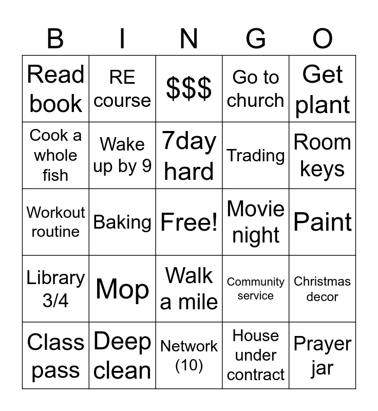 This bingo card has a free space and 24 words: Mop, Deep clean, 7day hard, Class pass, Get plant, Read book, Cook a whole fish, RE course, Movie night, Walk a mile, Trading, Workout routine, Community service, Christmas decor, Wake up by 9, House under contract, Paint, $$$, Room keys, Baking, Prayer jar, Library 3/4, Go to church and Network (10).