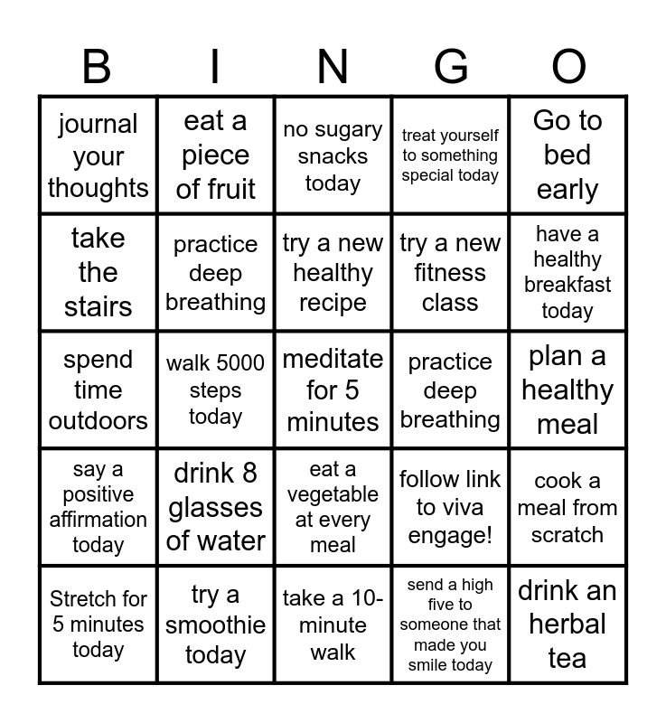 This bingo card has 25 words: drink 8 glasses of water, take a 10-minute walk, try a new healthy recipe, Stretch for 5 minutes today, Go to bed early, journal your thoughts, take the stairs, eat a piece of fruit, practice deep breathing, eat a vegetable at every meal, try a new fitness class, spend time outdoors, follow link to viva engage!, cook a meal from scratch, practice deep breathing, drink an herbal tea, plan a healthy meal, no sugary snacks today, have a healthy breakfast today, walk 5000 steps today, meditate for 5 minutes, try a smoothie today, say a positive affirmation today, treat yourself to something special today and send a high five to someone that made you smile today.