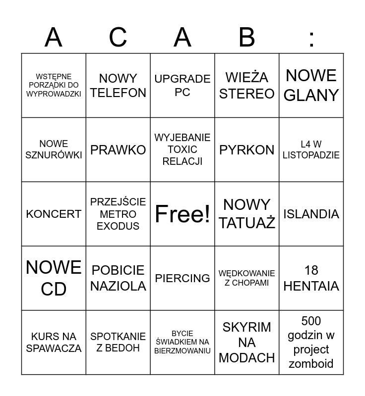 This bingo card has a free space and 24 words: POBICIE NAZIOLA, SPOTKANIE Z BEDOH, WYJEBANIE TOXIC RELACJI, KURS NA SPAWACZA, NOWE GLANY, WSTĘPNE PORZĄDKI DO WYPROWADZKI, NOWE SZNURÓWKI, NOWY TELEFON, NOWY TATUAŻ, PIERCING, PYRKON, KONCERT, WĘDKOWANIE Z CHOPAMI, 18 HENTAIA, PRAWKO, SKYRIM NA MODACH, ISLANDIA, UPGRADE PC, L4 W LISTOPADZIE, PRZEJŚCIE METRO EXODUS, 500 godzin w project zomboid, NOWE CD, WIEŻA STEREO and BYCIE ŚWIADKIEM NA BIERZMOWANIU.