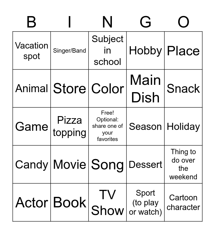 This bingo card has a free space and 24 words: Movie, Book, Color, Actor, Place, Vacation spot, Animal, Singer/Band, Season, Song, Main Dish, Game, Dessert, Thing to do over the weekend, Store, Sport (to play or watch), Holiday, Subject in school, Snack, Pizza topping, Cartoon character, Candy, Hobby and TV Show.