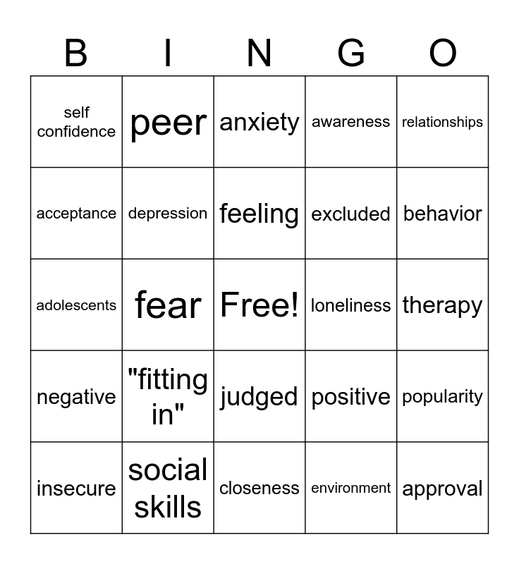 This bingo card has a free space and 29 words: insecure, rejection, fear, body image, self confidence, anxiety, depression, "fitting in", loneliness, social skills, therapy, approval, closeness, environment, behavior, peer pressure, judged, negative, relationships, adolescents, positive, self esteem, excluded, acceptance, awareness, peer, popularity, feeling and validation.
