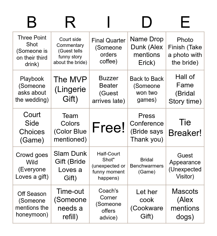 This bingo card has a free space and 24 words: Slam Dunk Gift (Bride Loves a Gift), Time-out (Someone needs a refill), Buzzer Beater (Guest arrives late), Off Season (Someone mentions the honeymoon), Photo Finish (Take a photo with the bride), Three Point Shot (Someone is on their third drink), Playbook (Someone asks about the wedding), Court side Commentary (Guest tells funny story about the bride), Press Conference (Bride says Thank you), Half-Court Shot" (unexpected or funny moment happens), Back to Back (Someone won two games), Court Side Choices (Game), Bridal Benchwarmers (Game), Guest Appearance (Unexpected Visitor), The MVP (Lingerie Gift), Let her cook (Cookware Gift), Tie Breaker!, Final Quarter (Someone orders coffee), Hall of Fame (Bridal Story time), Team Colors (Color Blue mentioned), Mascots (Alex mentions dogs), Crowd goes Wild (Everyone Loves a gift), Name Drop Dunk (Alex mentions Erick) and Coach's Corner (Someone offers advice).