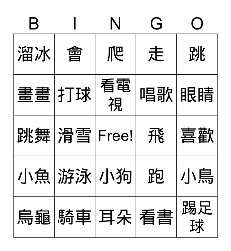 This bingo card has a free space and 24 words: 游泳, 騎車, 看電視, 烏龜, 跳, 溜冰, 畫畫, 會, 飛, 小狗, 唱歌, 跳舞, 跑, 小鳥, 打球, 看書, 喜歡, 爬, 眼睛, 滑雪, 踢足球, 小魚, 走 and 耳朵.