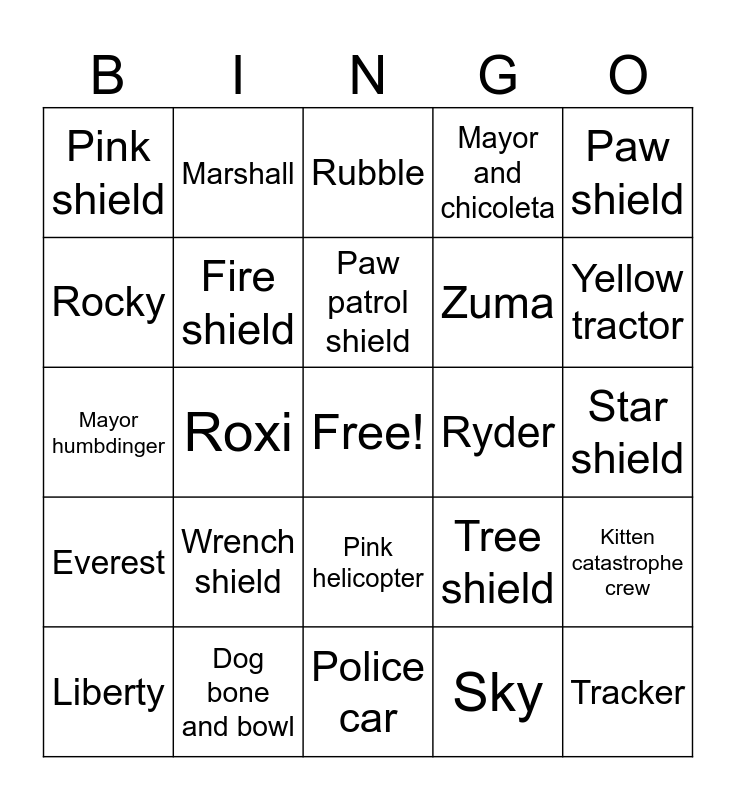 This bingo card has a free space and 28 words: Kitten catastrophe crew, Chase, Zuma, Sky, Rocky, Rubble, Marshall, Everest, Ryder, Liberty, Mayor humbdinger, Mayor and chicoleta, Dog bone and bowl, Police car, Yellow tractor, Fire truck, Wrench shield, Fire shield, Paw patrol shield, Pink helicopter, Pink shield, Recycle shield, Tracker, Roxi, Star shield, Tree shield, Paw shield and Anchor shield.